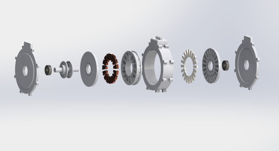 Two stators sandwich a single rotor disc. Both faces of the rotor see active torque, which effectively doubles the working area in a very thin package. The layout shortens flux paths, improves copper utilisation, and keeps the rotor disc simple and robust.